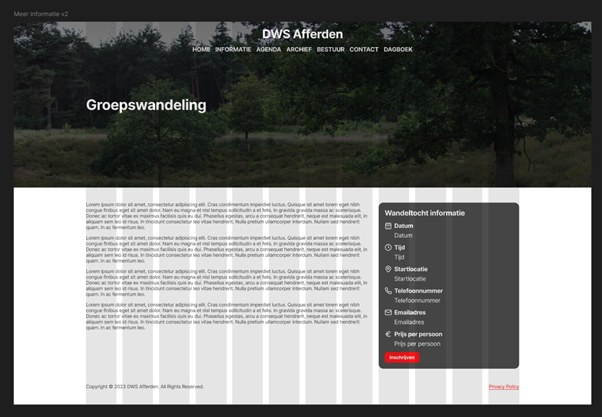After showing these 2 to my stakeholder she told me she wasn't the biggest fan of the cards so I went back and redesigned these. What I made now is 2 of the upcoming hikes and next to this a text area that tells you to click the button if you want more information. If the Figma files don't work, see Landing page v2 and Card component v2.