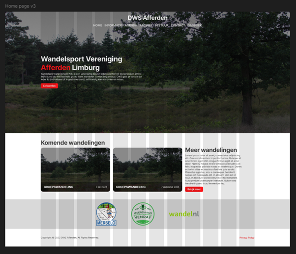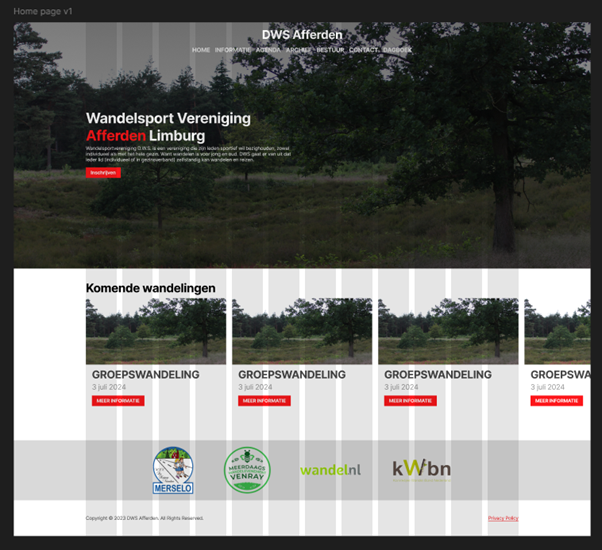 The first version of the sketch to Figma can be viewed below. If the Figma files don't work, see Landing page v1 and Card component v1. The landing page I tried to fully copy from the sketch to Figma. For the picture at the top, I went to the forest near my town and took some pictures with the camera I lent from school. Underneath the hero section is a section with the upcoming hikes. These will be placed next to each other and can be clicked to view a more detailed version. Under this are the "sponsors" and finally we have the footer.